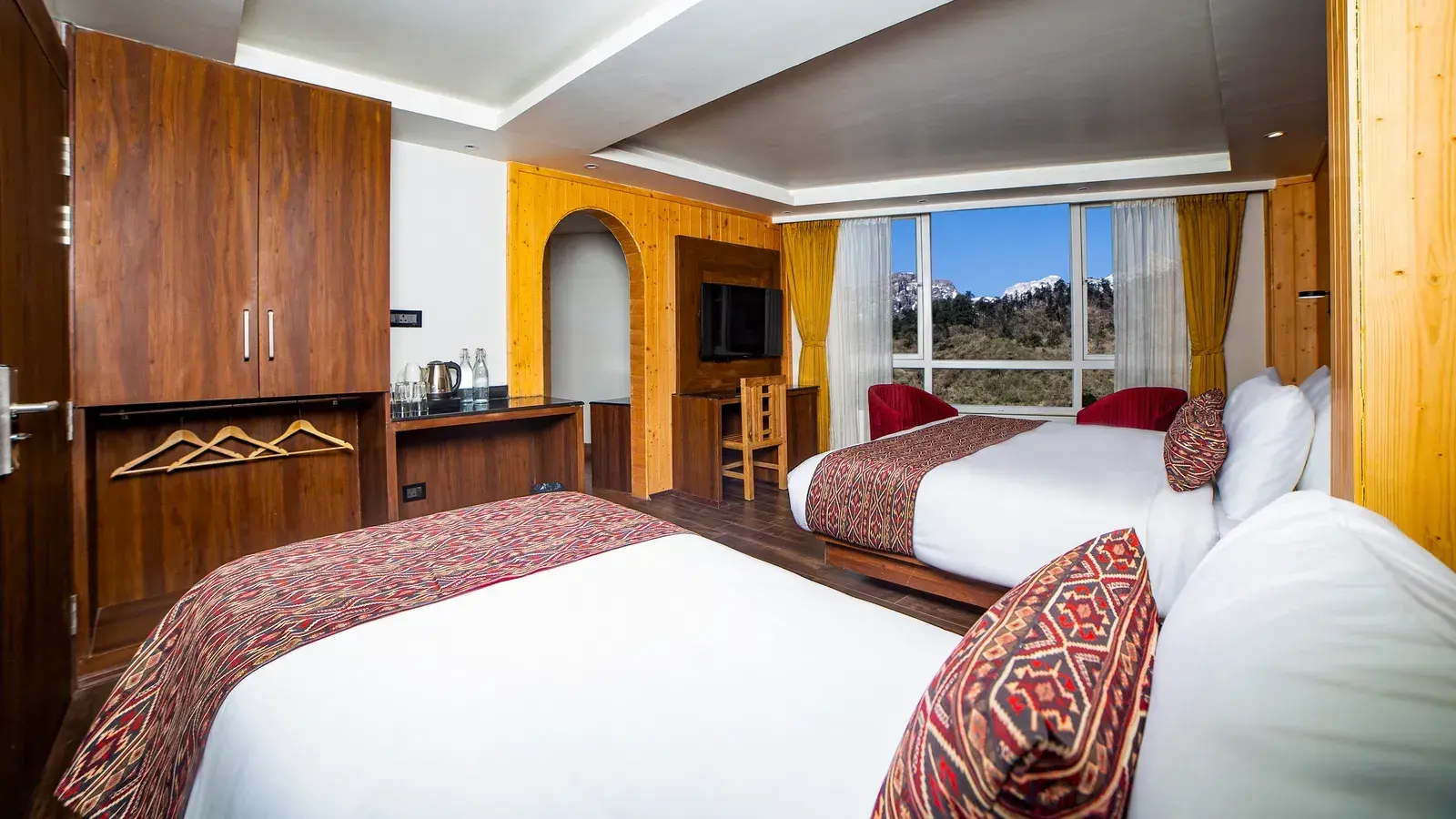 These 300 sq. ft. Premium View Rooms offer the perfect retreat with a plush queen size bed, accommodating up to three guests. Wake up to the mesmerising mountain views right from your window and enjoy a refreshing cup of tea or coffee made with the in-room tea & coffee maker. With modern amenities like complimentary Wi-Fi and a 32-inch television, these Lachen rooms offer everything you need for a relaxing and scenic getaway.