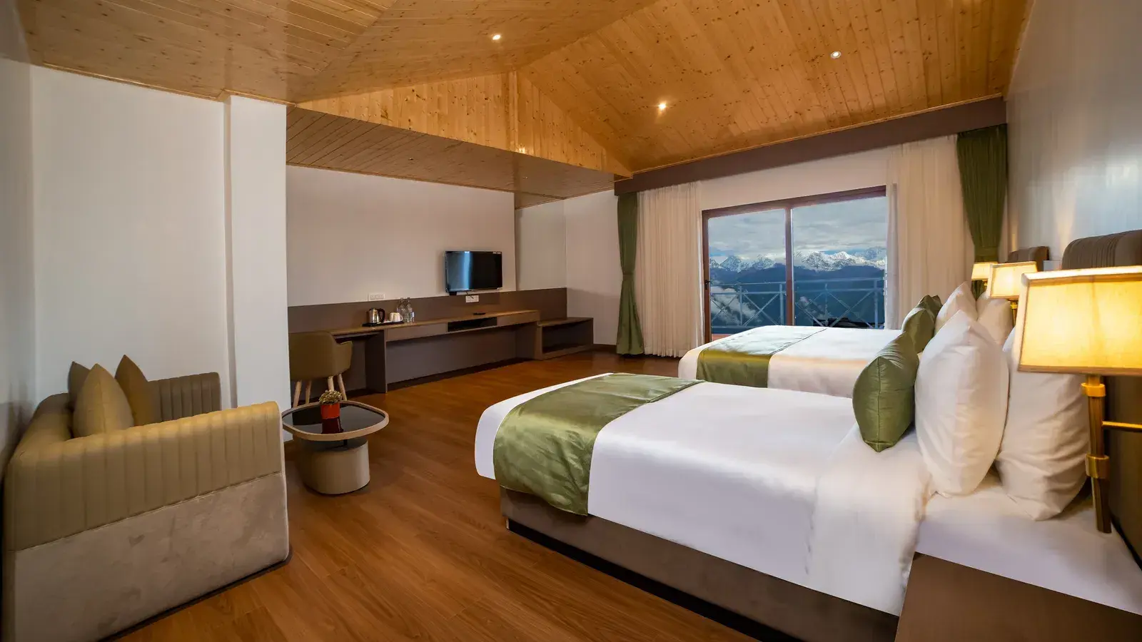 Our resort near Pemayangtse Monastery features a private balcony with picturesque valley views, offering a peaceful escape in the heart of Pelling. Thoughtfully designed for comfort and convenience, each room includes a charming wooden cottage-style ceiling that adds warmth to the space. From cosy retreats for couples to spacious family stays, the accommodations are ideal for both leisure and work. Whether you're waking up to misty mornings or unwinding after a day of exploration, every room promises a serene stay amidst nature.